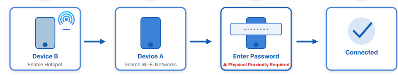 This scenario is when Device A connects to Device B’s personal hotspot. If it is the initial connection, the password set on the providing Device B is required to enable the connection.
