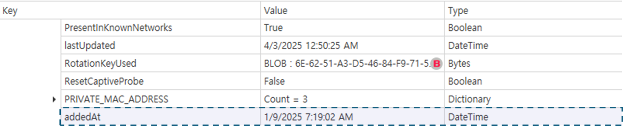 • The AddedAt key in the com.apple.wifi.known-networks.plist file and the AddedAt key in the com.apple.wifi-private-mac-networks.plist file record the timestamp when the hotspot was initially connected.