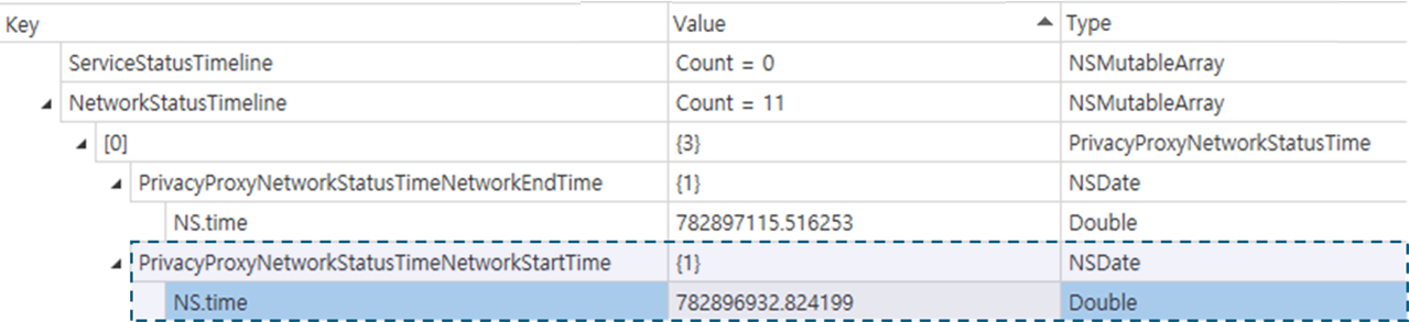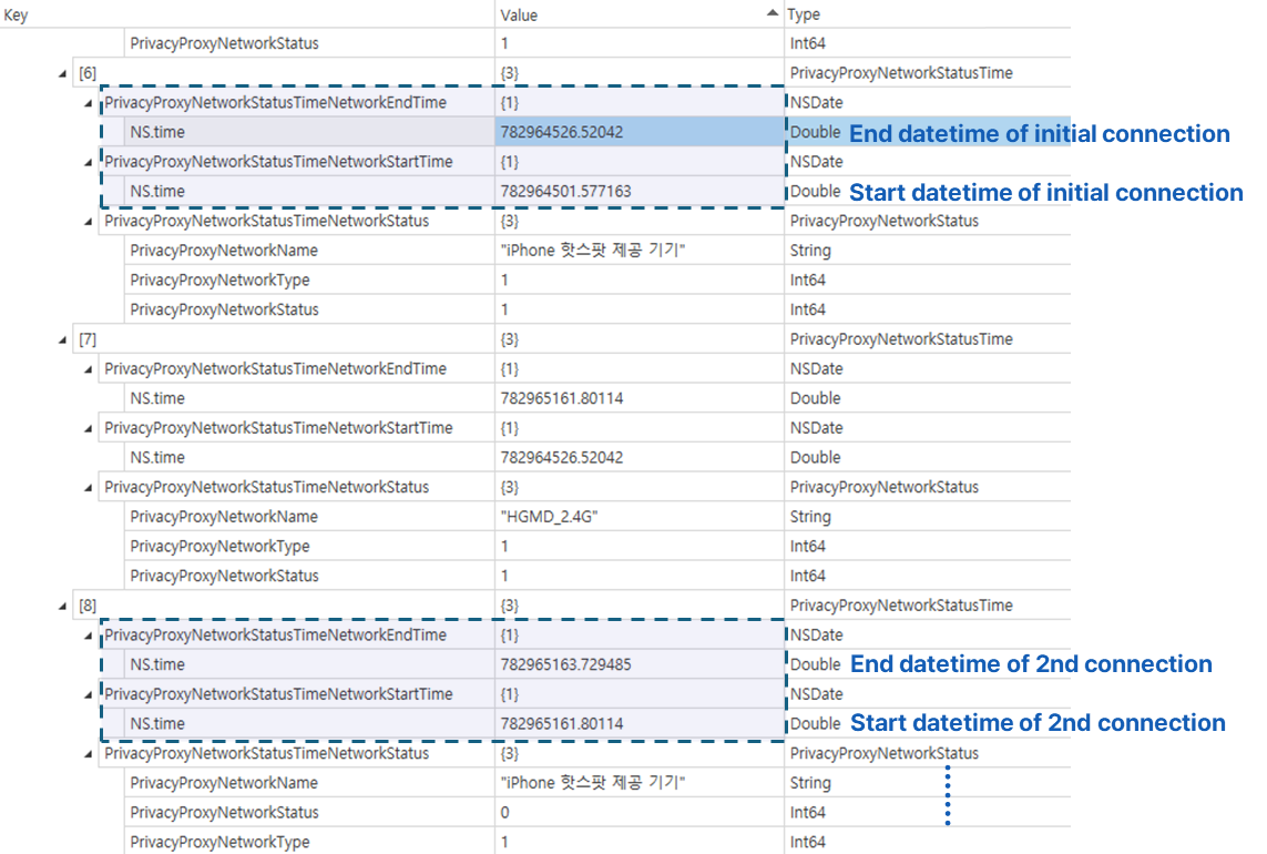 • The NSPServiceStatusMAnagerInfo key in the com.apple.networkserviceproxy.plist file contains blob-processed Plist data with detailed hotspot connection information. In each NS.time key, under PrivacyProxyNetworkStatusTimeNetworkStartTime andPrivacyProxyNetworkStatusTimeNetworkEndTime keys, you cna find the timestamp the hotspot was connected and disconnected. The timestamp is recorded in CFAbsoluteTime format.